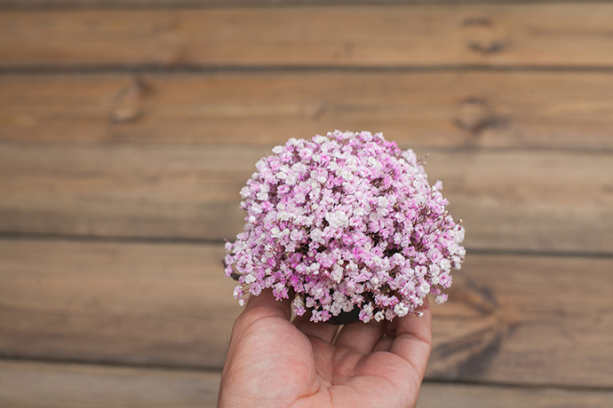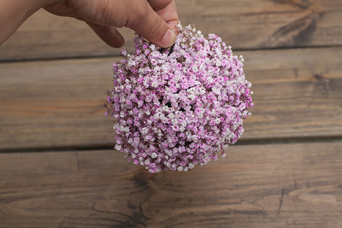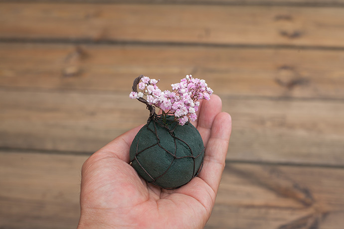 将花泥置于钢丝网最中间,用钢丝缠绕花泥并逐渐收起。根据作品的需要,将满天星裁剪成长度为3、4厘米的单朵状。