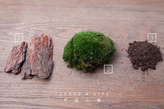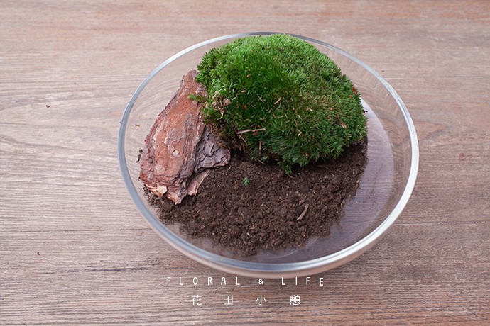 先将树皮放入花器中的一侧,再把苔藓放置于湿润的土壤之上进行养护,制作过程中尽量保持苔藓的