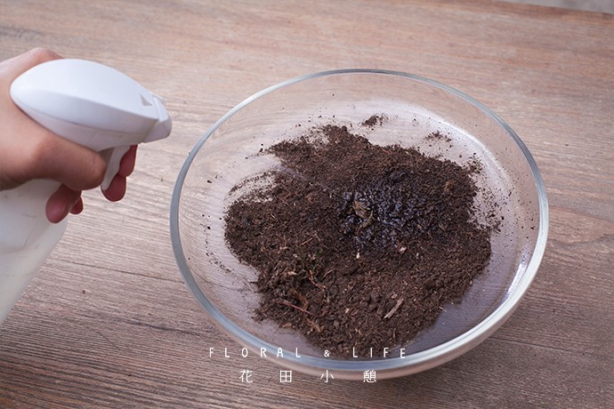 针对花器中的土壤,可喷适量的清水保持土壤的潮湿,避免制作过程中尘土飞扬,同时利于延长苔藓的存活周期。