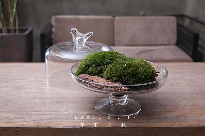 最后将玻璃罩盖在花器上,让清澈透亮的鸟儿伴着苔藓的盎然之意,呈现生命的质感,作品完成。玻璃盖需每天定时打开,让苔藓获取新鲜空气,同时喷水保证容器内的空气湿度。