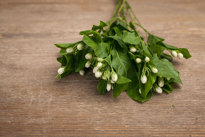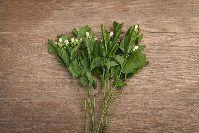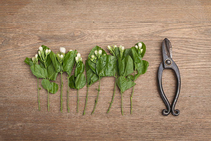 先用花艺剪将茉莉下方多余枝叶修剪掉,并将分支剪成等齐的小束。
