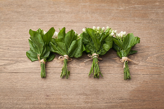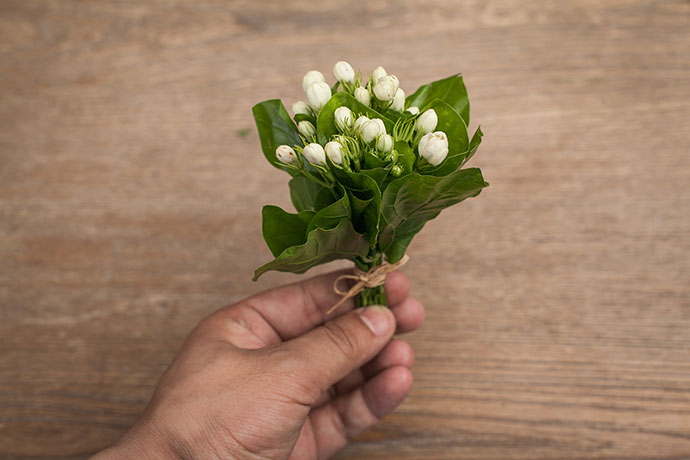 依次将茉莉扎成迷你花束,拉菲草绑在叶子下方,便于聚拢,以防花束松散。