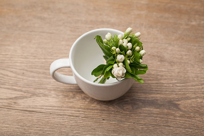 取一个常用的杯子,洗净后,将茉莉花束插入杯中,杯中花散发着淡淡的香气,清雅淡香。
