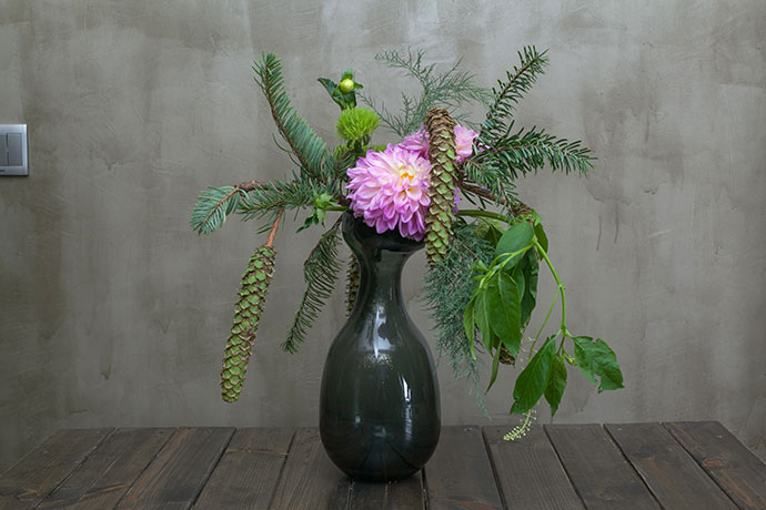 选取大丽花作为造型的主花材,高低错落的插制于花泥中心位置,作为造型的焦点.