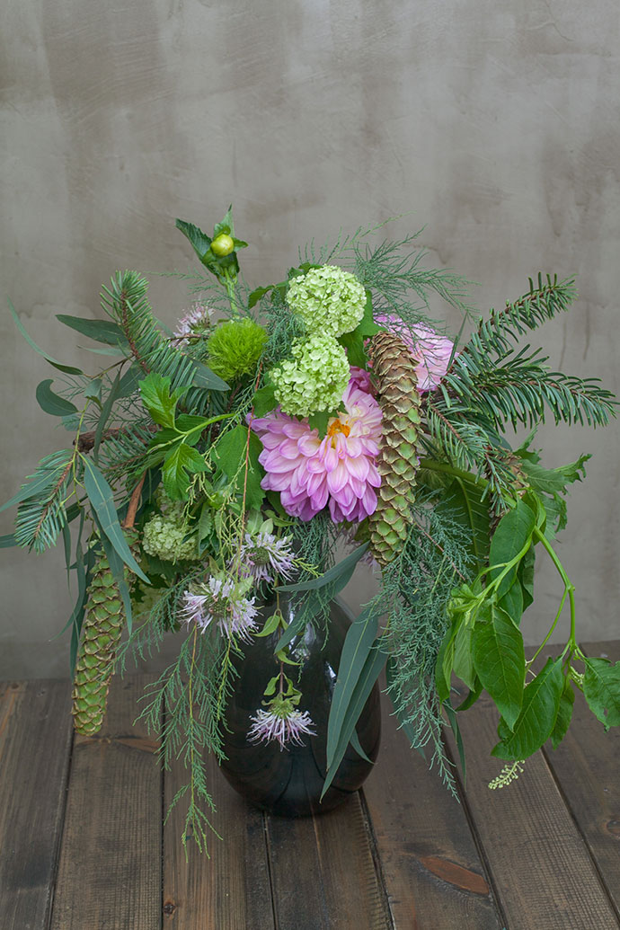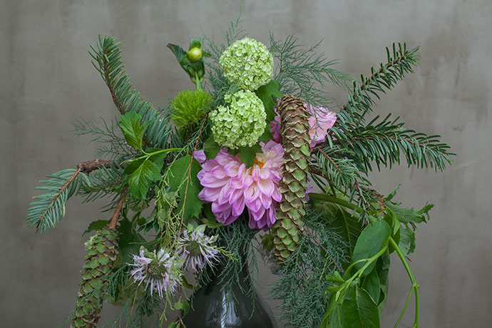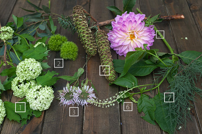 在搭建好的框架中,插入美国薄荷和木绣球丰满造型,同时加入线条性花材