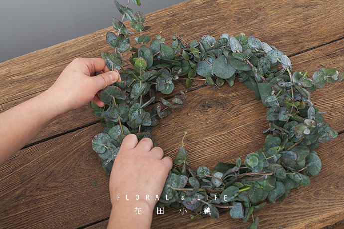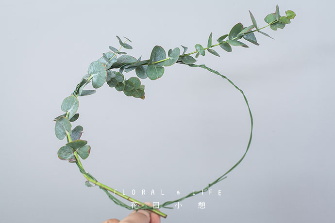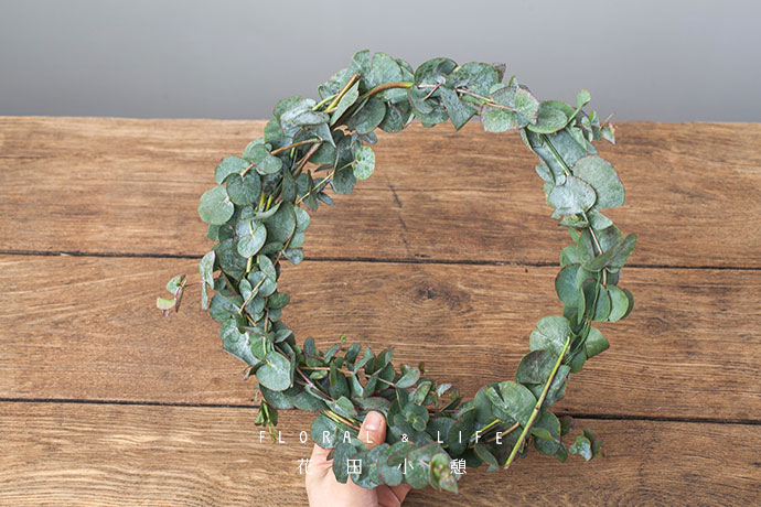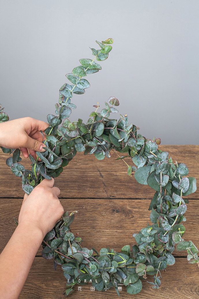 粗铁丝制作成圆环状,将圆叶尤加利旋转盘绕在圆环构架上。
