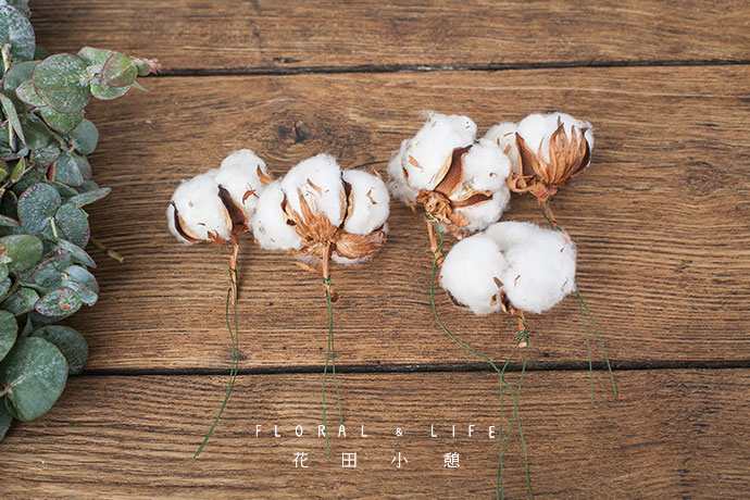 棉花分散固定在尤加利花环上,用白色丝带打一个法国结,打结处用细铁丝固定,捆绑在花环上即可。思念化成绕指柔,缠绕一圈一圈潺潺的心意,等待爱情的青鸟降临。