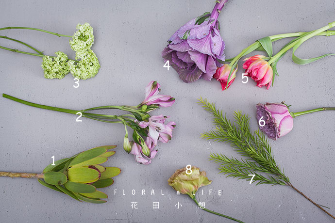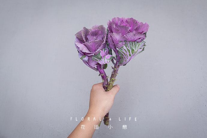 为了方便大家在花材搭配时的选择,花田小憩特设香味等级图谱,供大家在学习过程中了解更多植物的属性,以方便作品选择更适合的空间位置陈列。选取两支甘蓝握于手中。