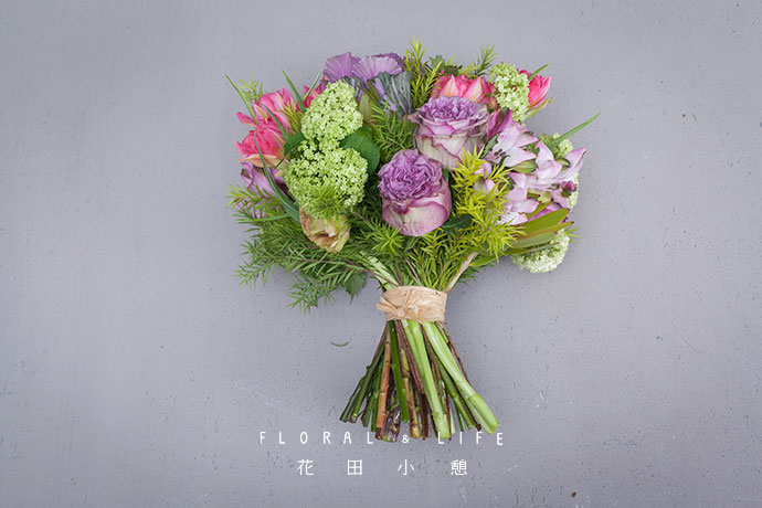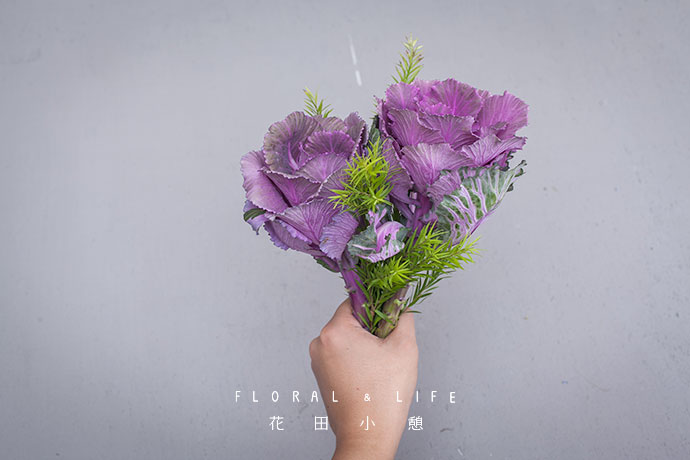 将系好的花束置于装有约1/2水的花器中,紫色的甘蓝,大气而优雅,于花束中虽不耀眼,却难掩风华。