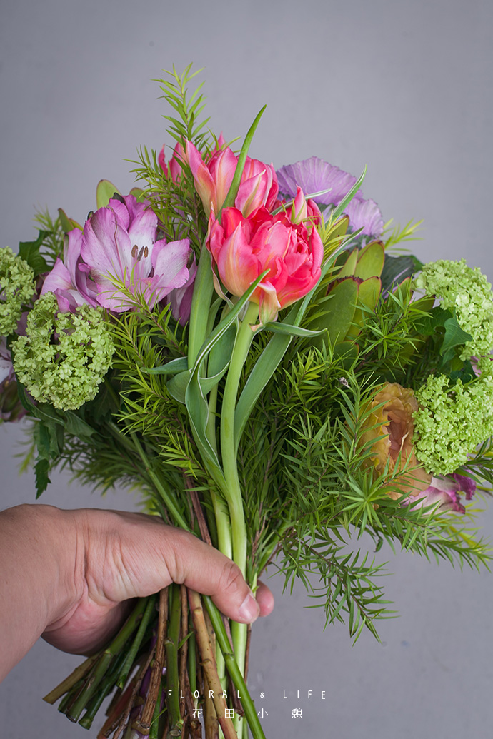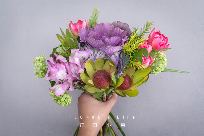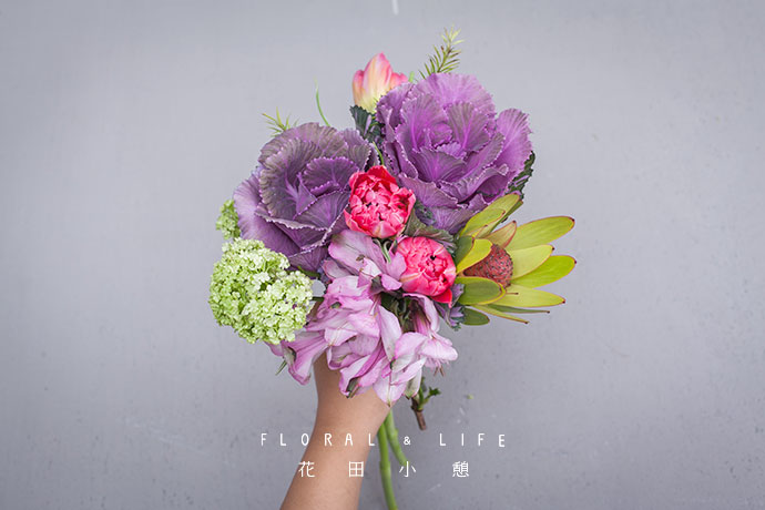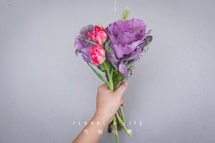 将两支郁金香与甘蓝并排握在手中。玫红色的郁金香与紫色的甘蓝,交相呼应。