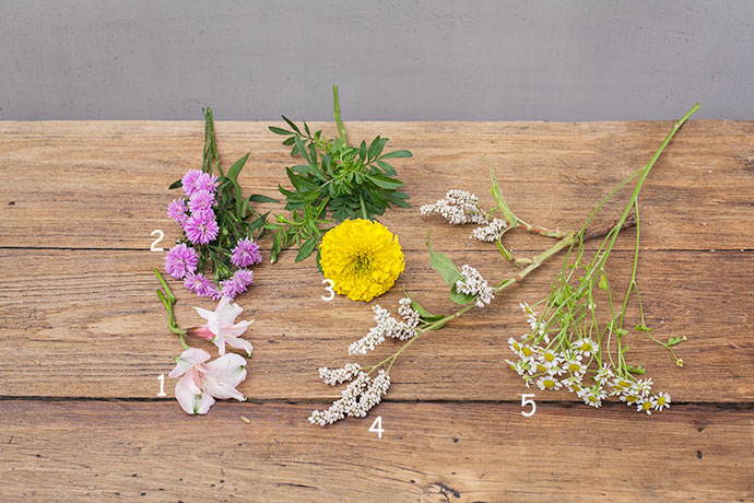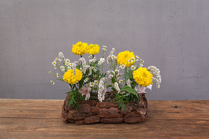 主花材万寿菊的末端花叶修剪后,竖直并排的插入花器中。