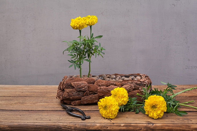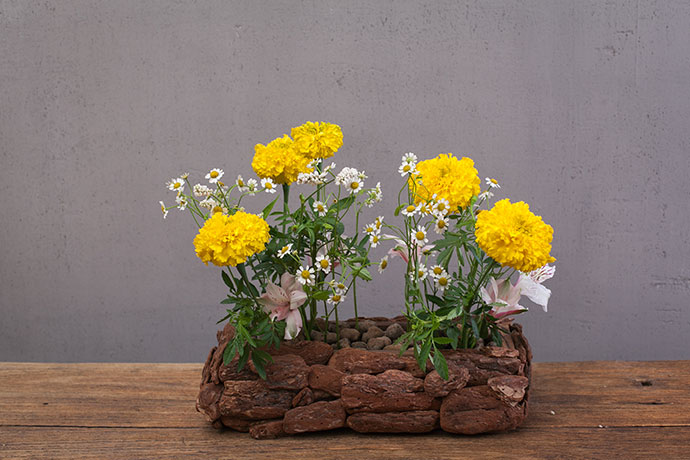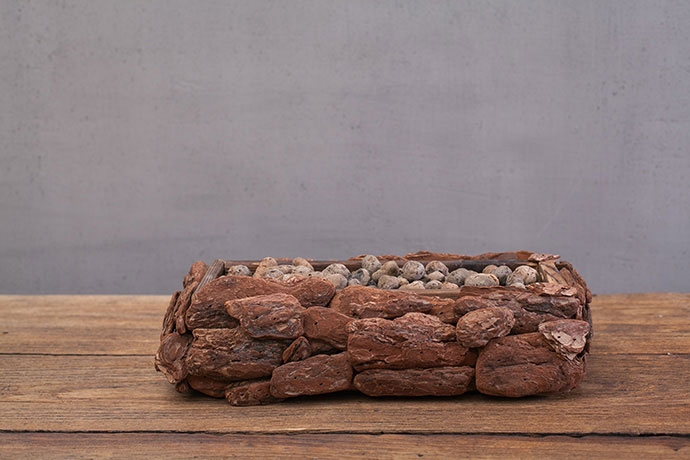 选一个木制的长方体花器,并在花器中平整的铺满陶粒。树木与陶粒的搭配,更加的生动自然。