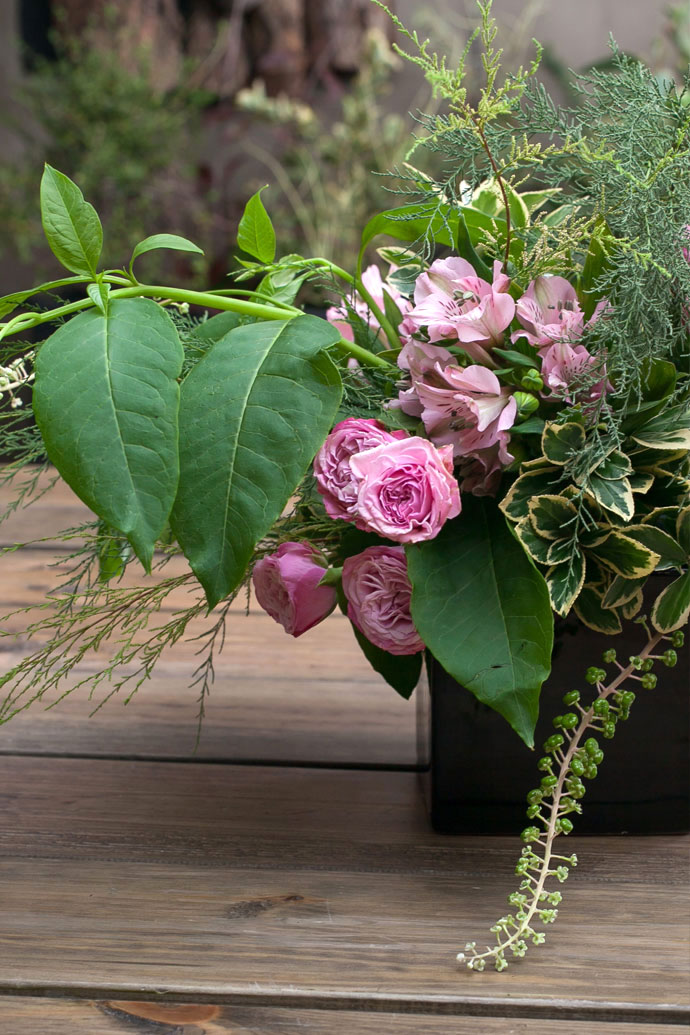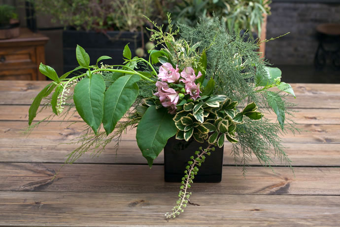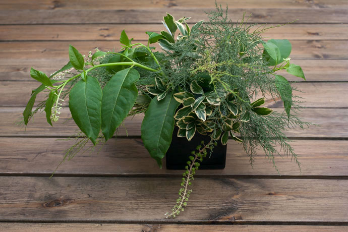 将黄杨和观音柳,在挨着商陆的位置,依次插入花泥中。之后,整理枝叶,使其营造出蓬勃之感。就似古时的才子,总是喜欢聚在一起,赏美景、谈风月。
