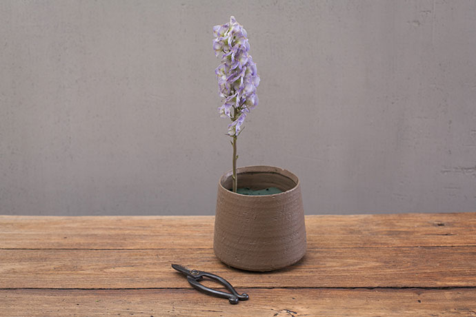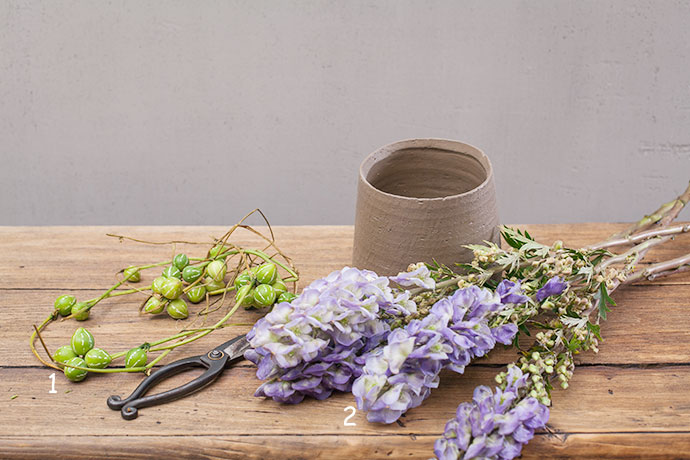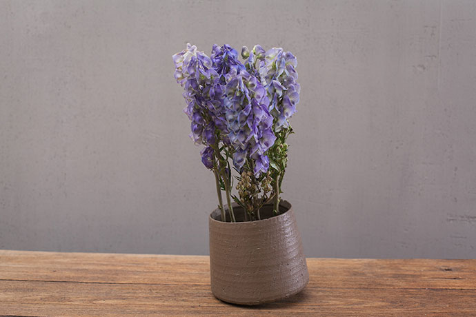 修剪好的乌头草竖直的插入花器的一侧。