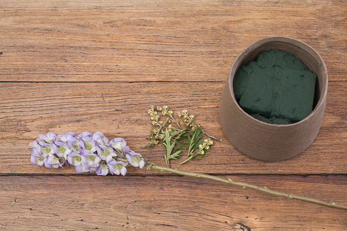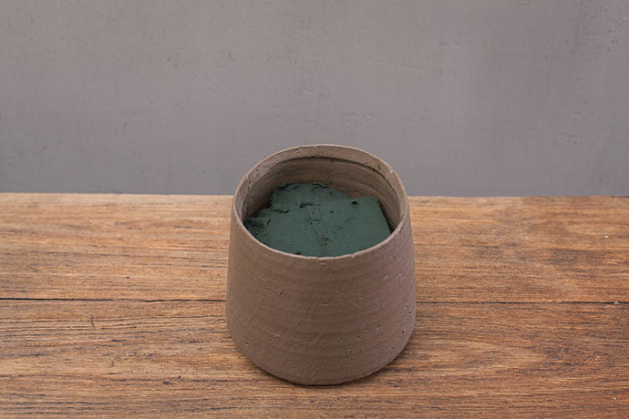 选择一个梯形的花器,将花泥放入器皿内,低于花器口2cm。
