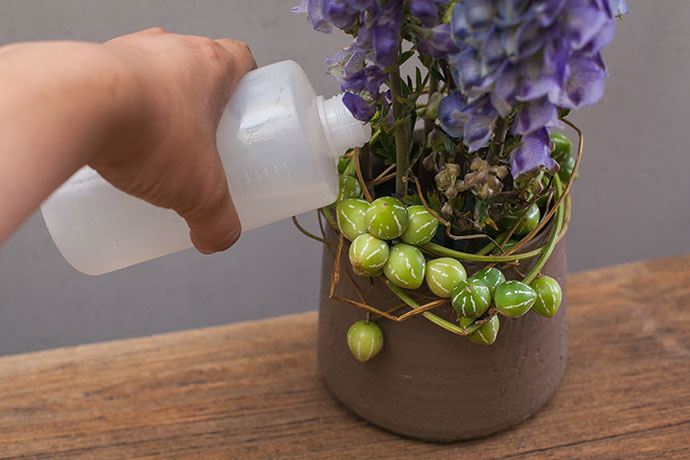 用注水器向花器中注入清水,保持花泥湿润,以供给花植所需的水分。