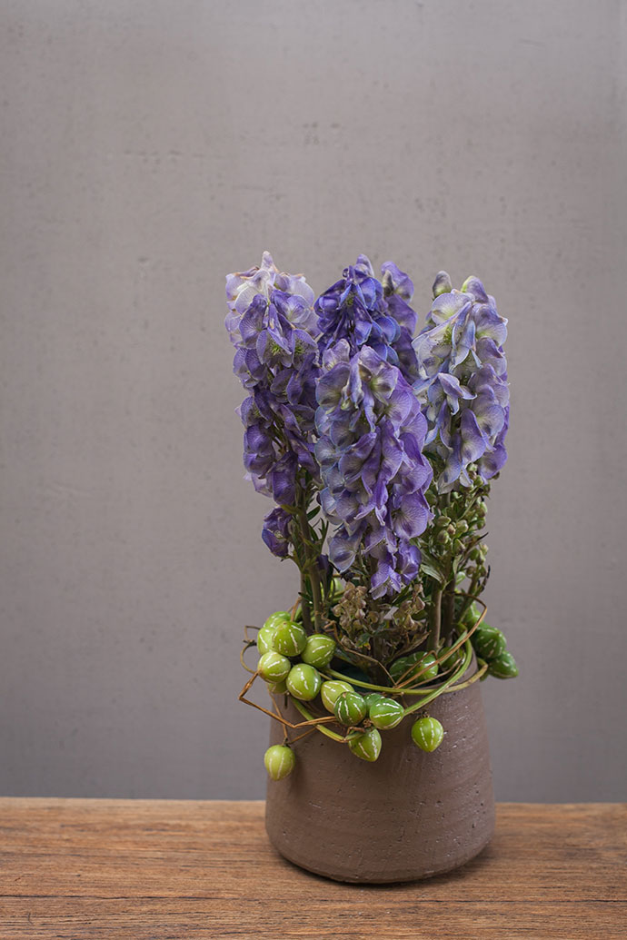 依次将剩余的乌头草平行的插入花器中。花器底部自然倾斜的不倒翁设计,令作品更加富有趣味性。