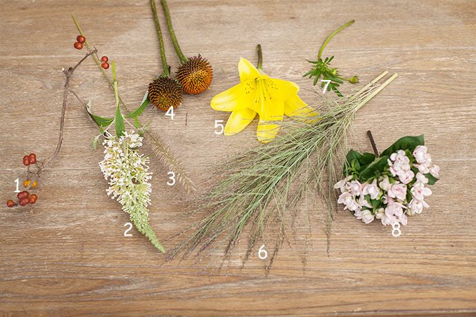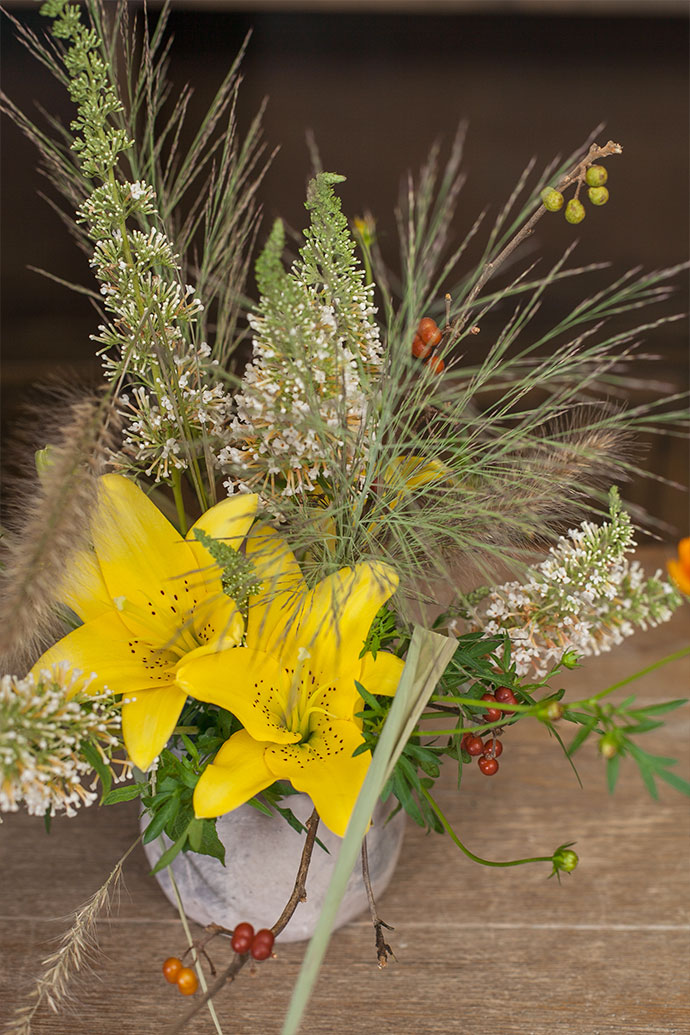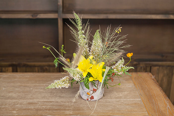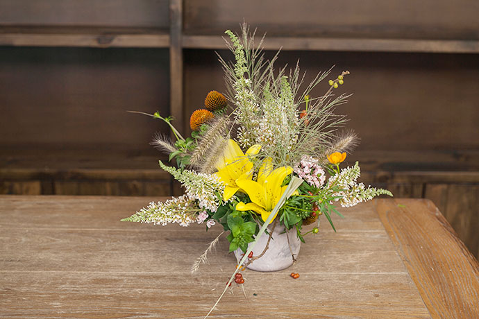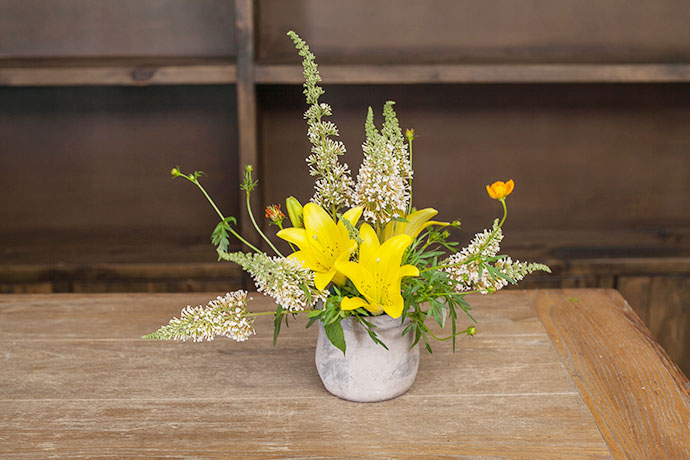 将百合花插入波斯菊的间隙中,橙黄色的波斯菊碰上淡黄色的百合花,高贵典雅中带着一份欢欣的喜悦。