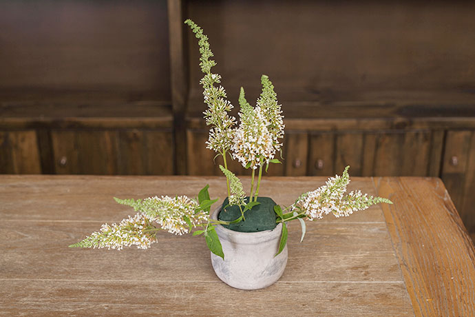 醉鱼草分为三个方向分别插入花泥中。左右各为2支,中间为3支。