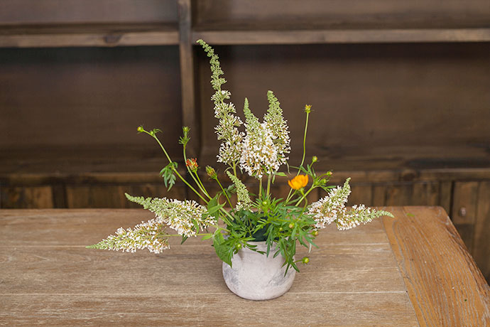 为了方便大家在花材搭配时的选择,花田小憩特设香味等级图谱,供大家在学习过程中了解更多植物的属性,以方便作品选择更适合的空间位置陈列。醉鱼草分为三个方向分别插入花泥中。左右各为2支,中间为3支。