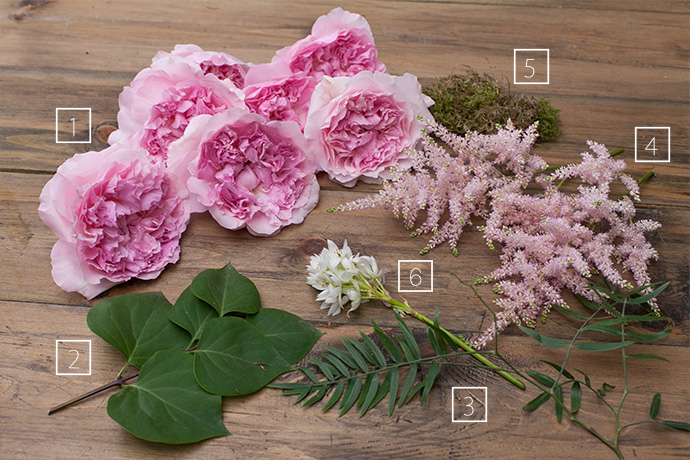 陆续加入落新妇,以相近色系搭配的形式,保持花材间均衡与稳定性,并逐步丰满并完善造型。