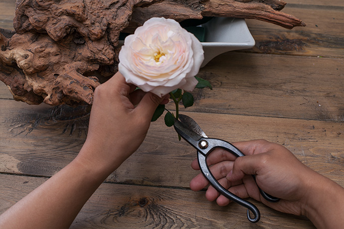 选取饱满鲜艳的大卫·奥斯汀玫瑰,沿根茎倾斜剪短,有利于水分吸收。