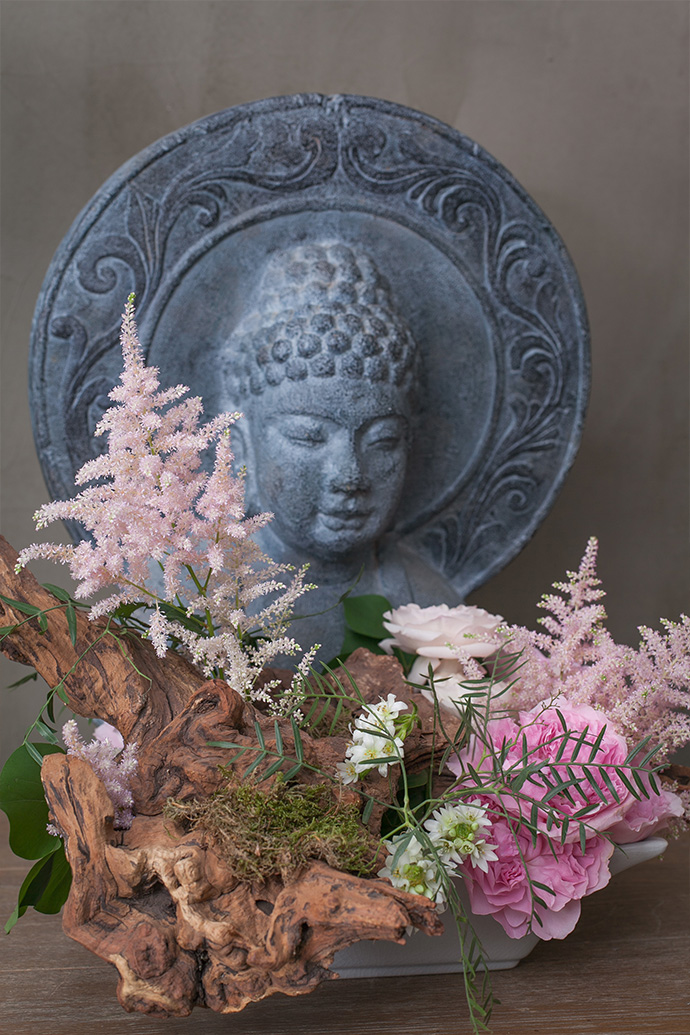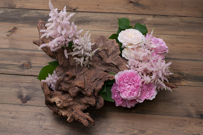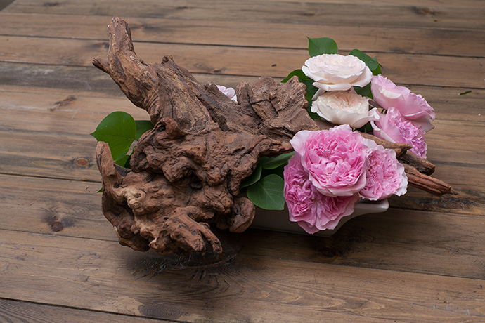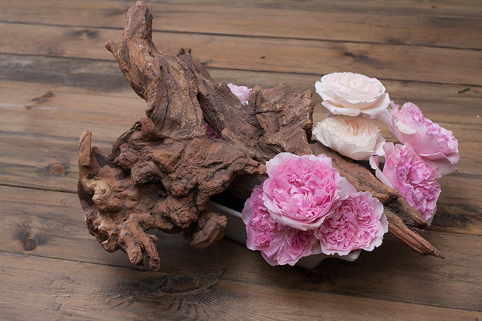 在沉木两侧高低错落的插入大卫·奥斯汀玫瑰,盛开的玫瑰与沉木的老成形成鲜明的对比。