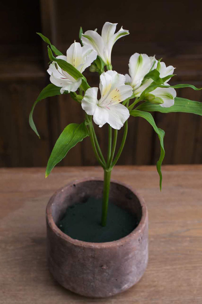 先将1支百合插入花器中,然后将剩余的水仙百合插入花器,成等腰三角型的形状。