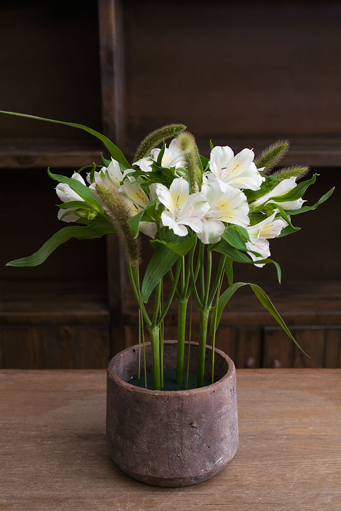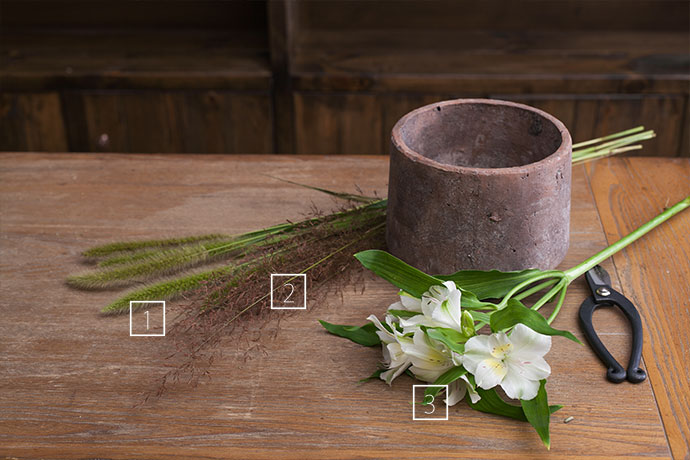 再依次将狗尾草和小燕麦插入水仙百合的四周,使其散落的分布。
