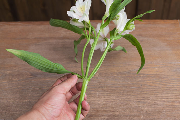 将水仙百合茎部多余的枝叶部分去掉。