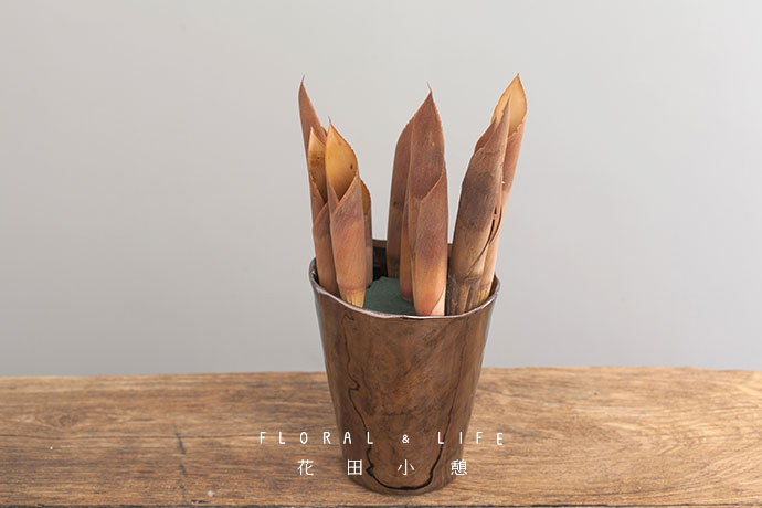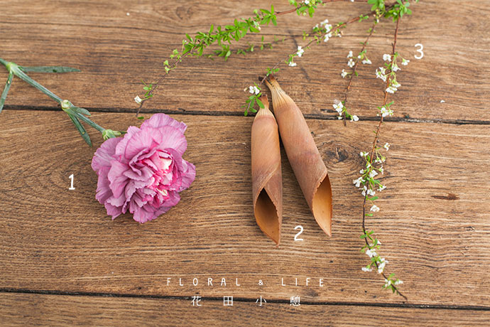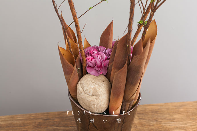 将康乃馨插入干竹笋中间的缝隙中,干竹笋好似枯干,康乃馨犹如破土而出的花精灵,美轮美奂。
