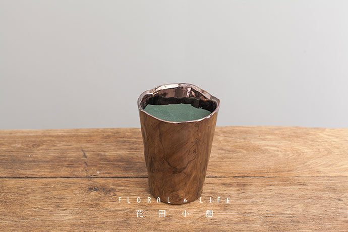 将进口干竹笋均匀分散插入花泥中,留取边缘一处空隙,留作后期装饰。