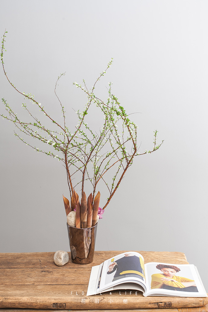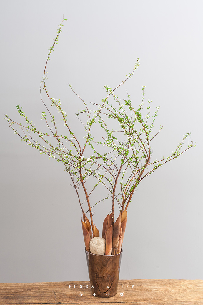 用石头放置在干竹笋留出的位置,作为装饰。选取悠扬舒展的雪柳,插入干竹笋的缝隙中,雪柳的枝干,天生就像风中飘扬的精灵,生机满满。