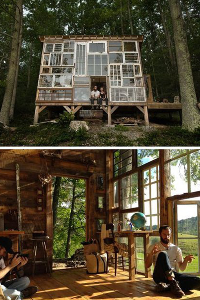 Facebook上的一对网红,Nick Olson 和Lilah Horwitz,在自然里,花五百美金建造了一个以木头和玻璃为材质的梦想之屋。他们用废弃的窗子拼接成玻璃花房的一面,疏影绰绰,透入温柔的房间之中。