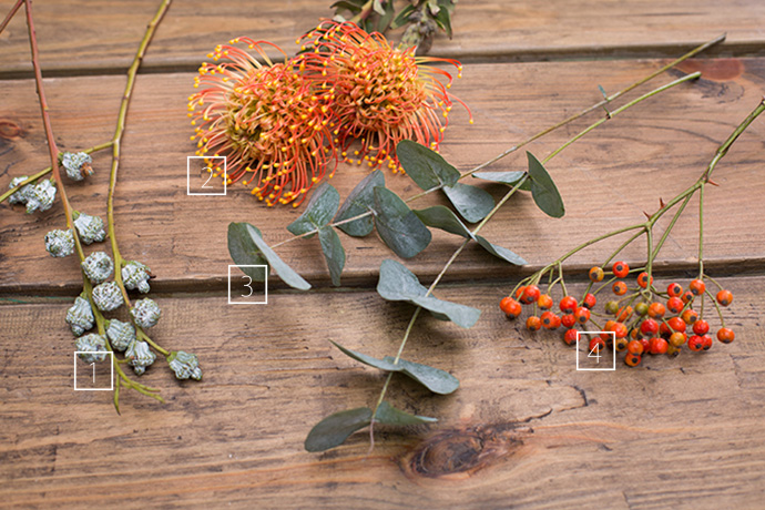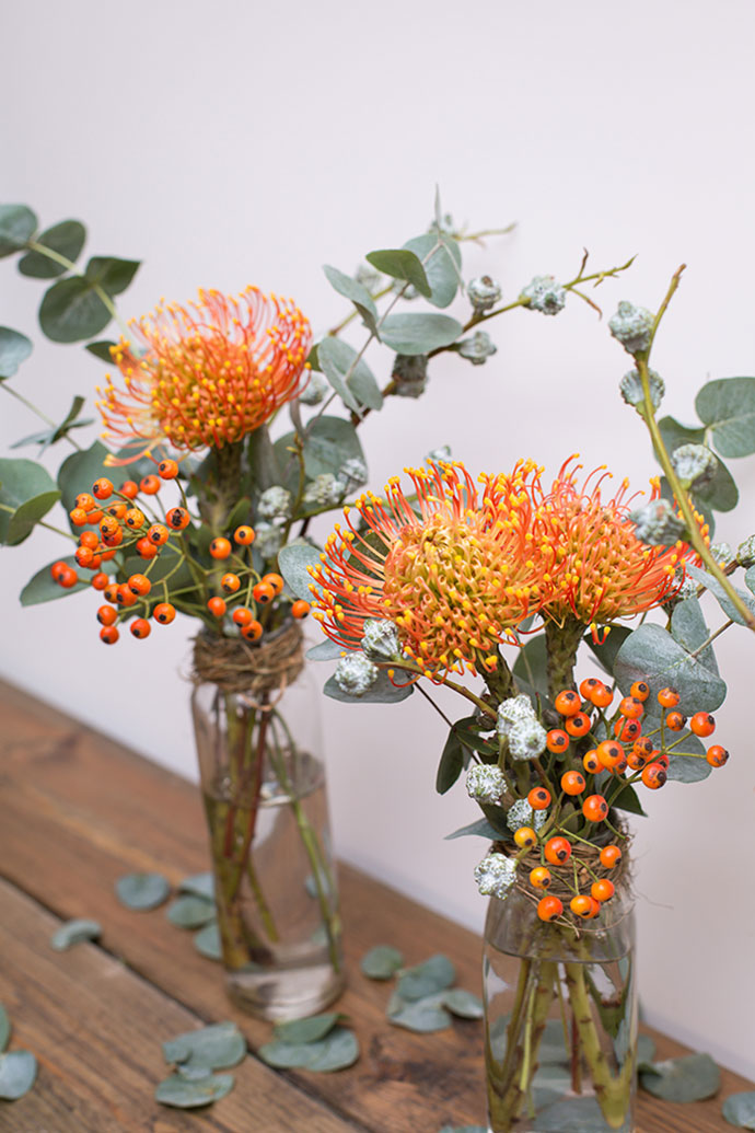 将蔷薇果插入圆叶尤加利与尤加利果之间。圆圆小小的橘红色果子,可爱喜人。