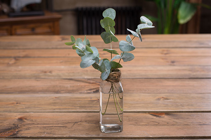 先取一个用拉斐草缠绕好的玻璃花瓶,注入约2/3的水。可使鲜花在干燥的秋季保持水分。并将圆叶尤加利分散插入花瓶中。微醺的香气,在这个平淡的季节里,格外喜人。