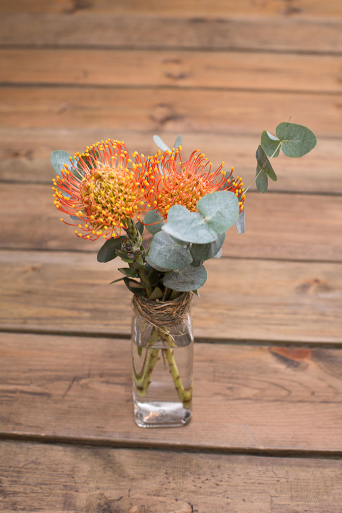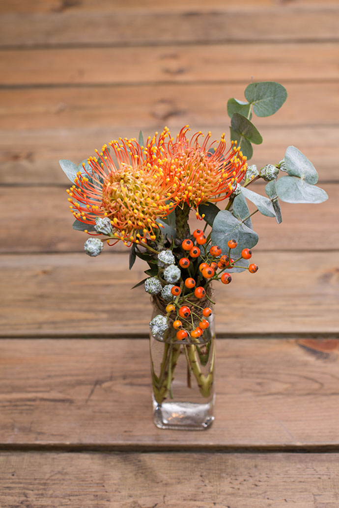 将两支针垫花,交叉插入花瓶中。从红至橘的颜色,带着初秋的温暖与灿烂,就好像我对你的期待和依恋。