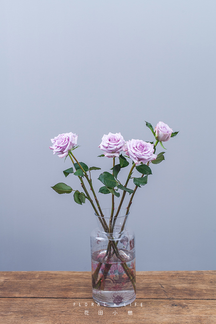 将海洋之歌玫瑰插入玻璃花器中,花器中水量应不低于2/3.