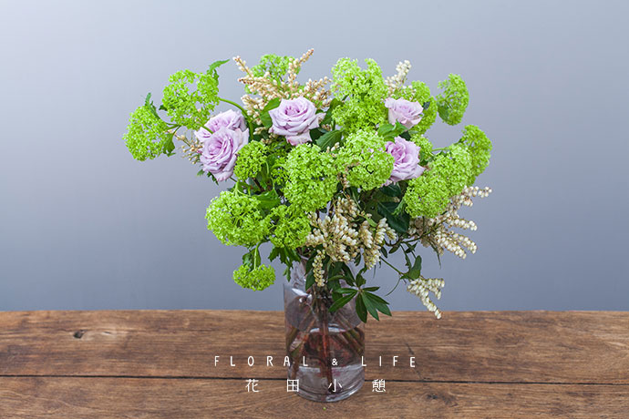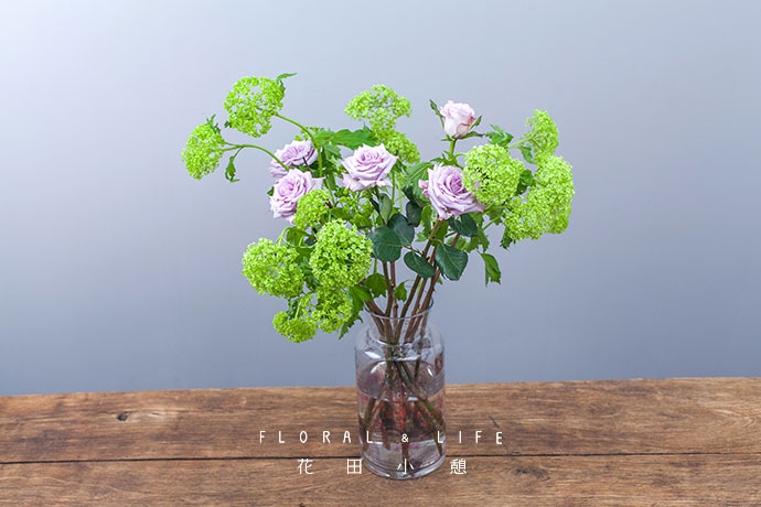 木绣球分散交错插入花器中,木绣球的嫩绿非常适合早春的明媚。