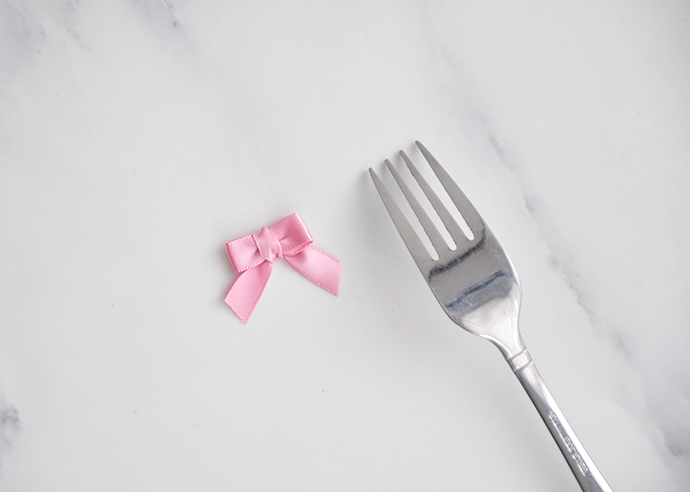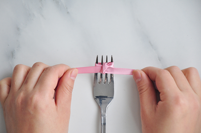 1. 准备一段比较细的丝带,和一把餐叉,餐叉一般都是四齿的。