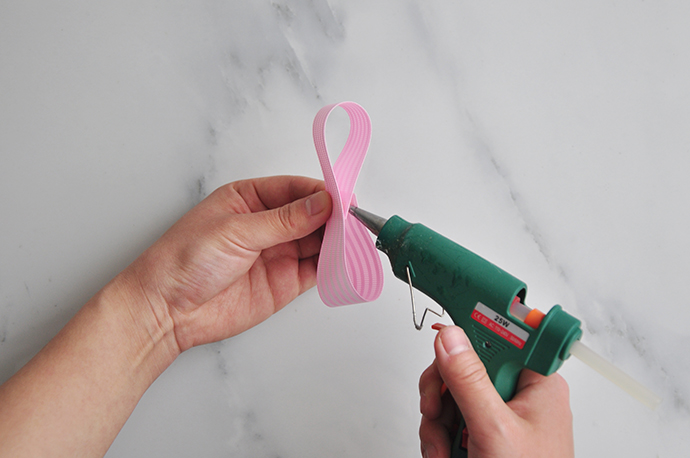 2.接下来就是把这三个“零件”用胶枪依次粘合起来,先做把一根丝带首位相接形成一个圆圈,从中间压扁形成两个蝴蝶结的耳朵,中间用胶枪固定。