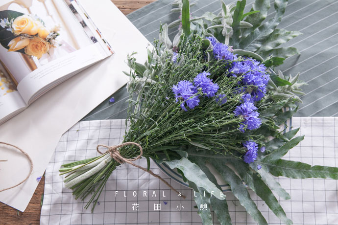 1.本期花材是满天星、矢车菊、贯众厥、银叶菊。