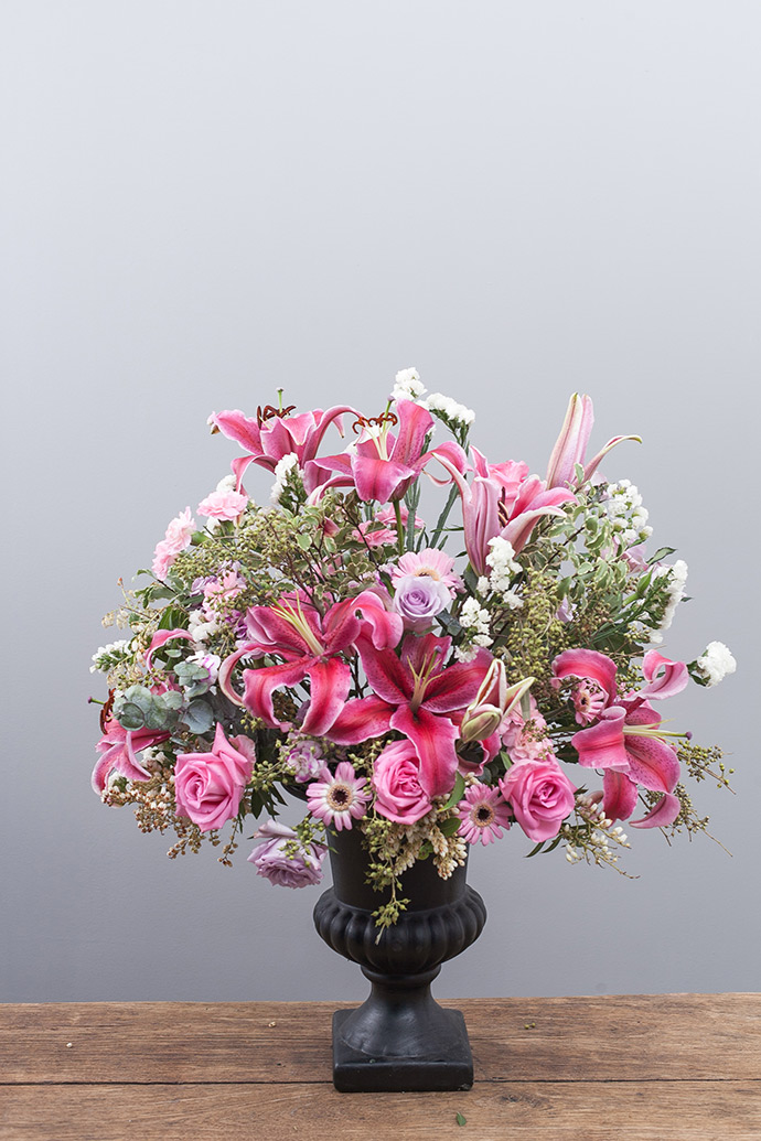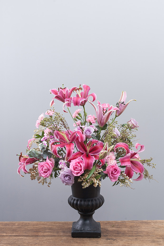 最后用白色的勿忘我勾勒出造型的明显外形。扇形其实并不是一个平板像扇子的形状,而是一个极具立体感“胖胖”的古典造型。很多婚礼和宴会,酒店陈列经常使用本造,提升空间的隆重感。