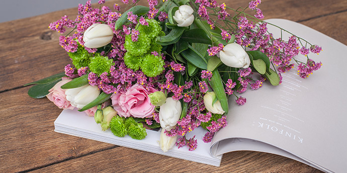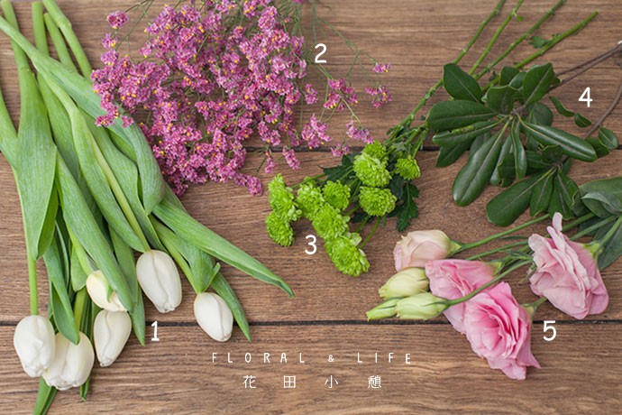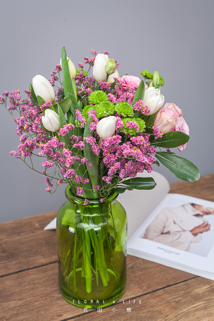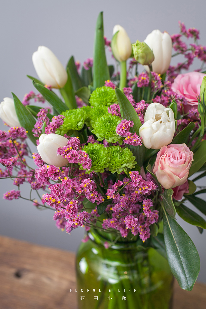 绚烂簇拥着纯白,明媚拥抱着纯净。玫粉的水晶草、淡粉的洋桔梗、浅绿的小雏菊,苍翠的海桐叶,将白色郁金香团团环绕,美好了那片安静的白。