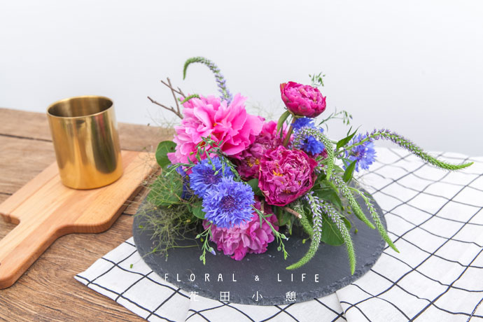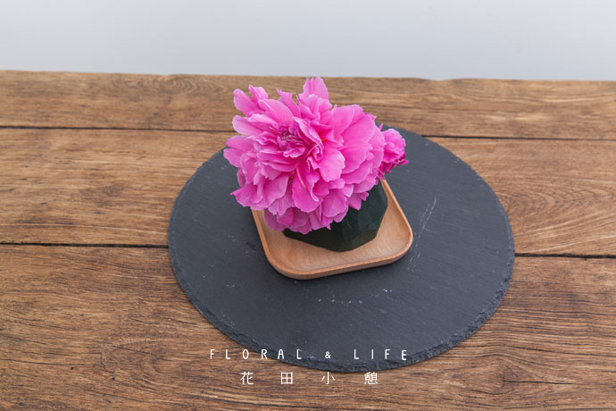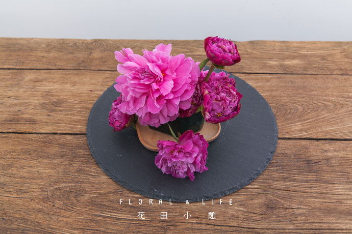 将已经开好的芍药插于花泥中间的主体位置。