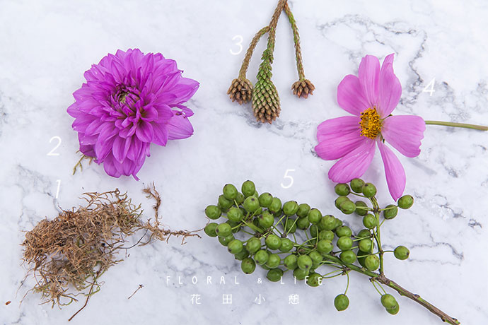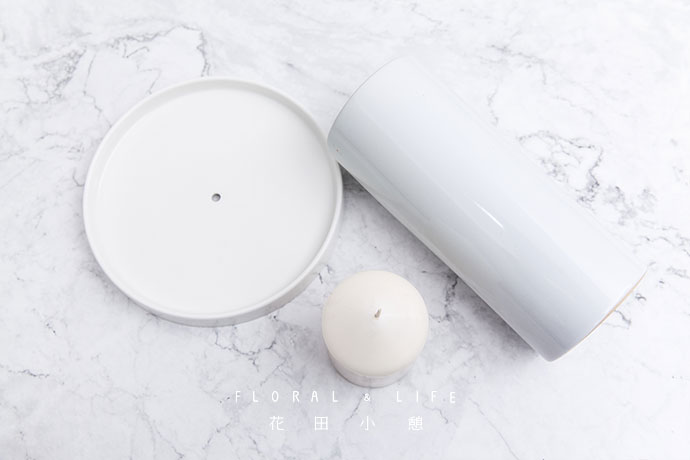为了方便大家在花材搭配时的选择,花田小憩特设香味等级图谱,供大家在学习过程中了解更多植物的属性,以方便作品选择更适合的空间位置陈列。准备高花瓶、盘子、蜡烛各一。