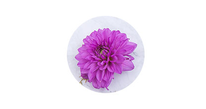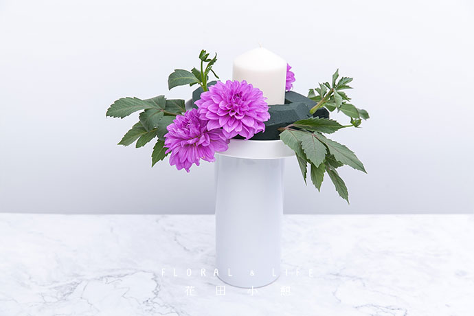 向花泥中插入3支大丽花作为该作品的主花,另外两侧插入几支绿叶填补空间遮盖花泥。
