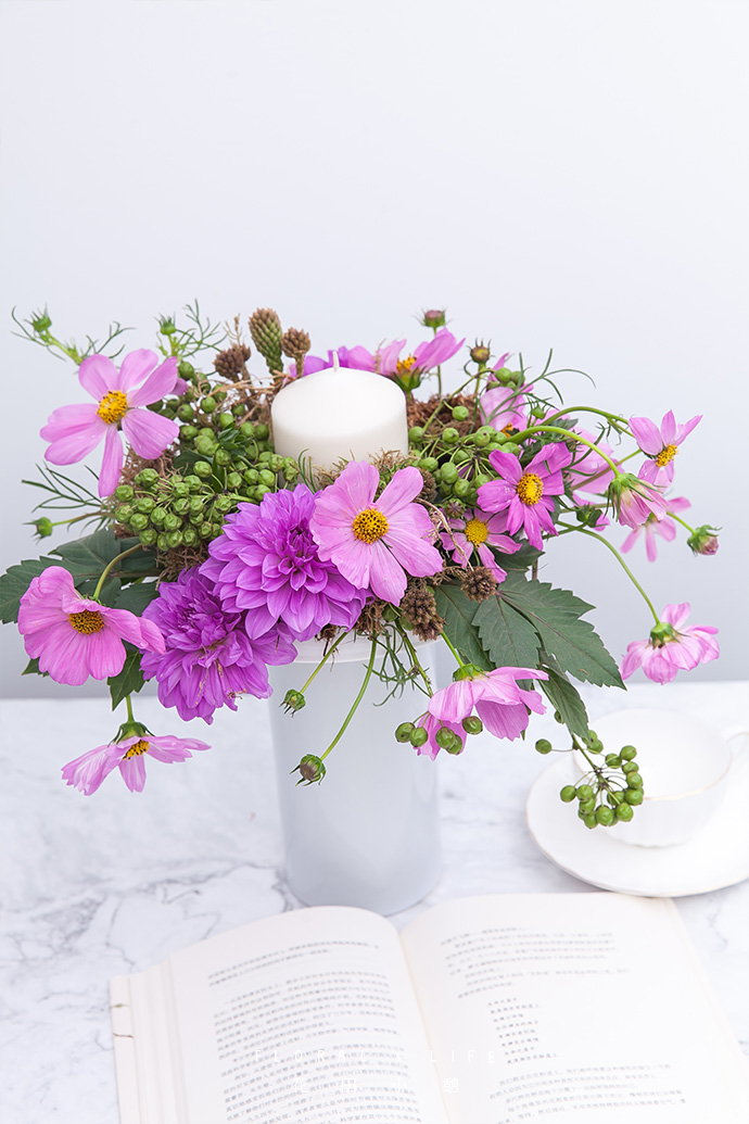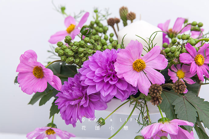 插入波斯菊,使作品形成一个圆形包围在蜡烛四周,注意花材间高低错落。