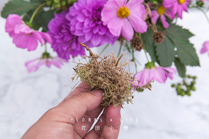 此时作品仍有少量花泥裸露的部分,拿出准备好的苔藓。