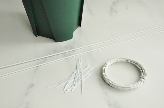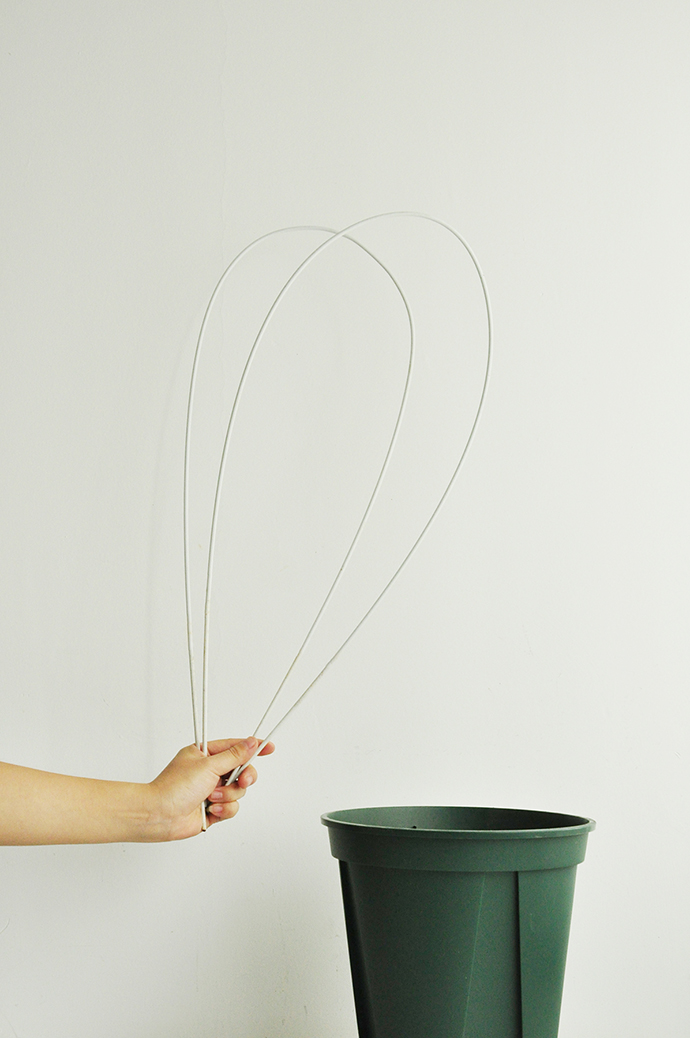 首先准备材料:准备两根一样长的园艺用白色包塑铁丝,铁丝的长度可以根据自己的花盆和植物的大小来决定。这两根铁丝是起主要的支撑作用的,所以需要有一定的硬度。小意达做的这个花架用了两根长度1米、直径4毫米的铁丝。除了铁丝还需要准备一卷比较细的铁丝用作盘线,硬度也不需要很高。这里是直径2毫米。另外再准备一些绑扎细铁丝。